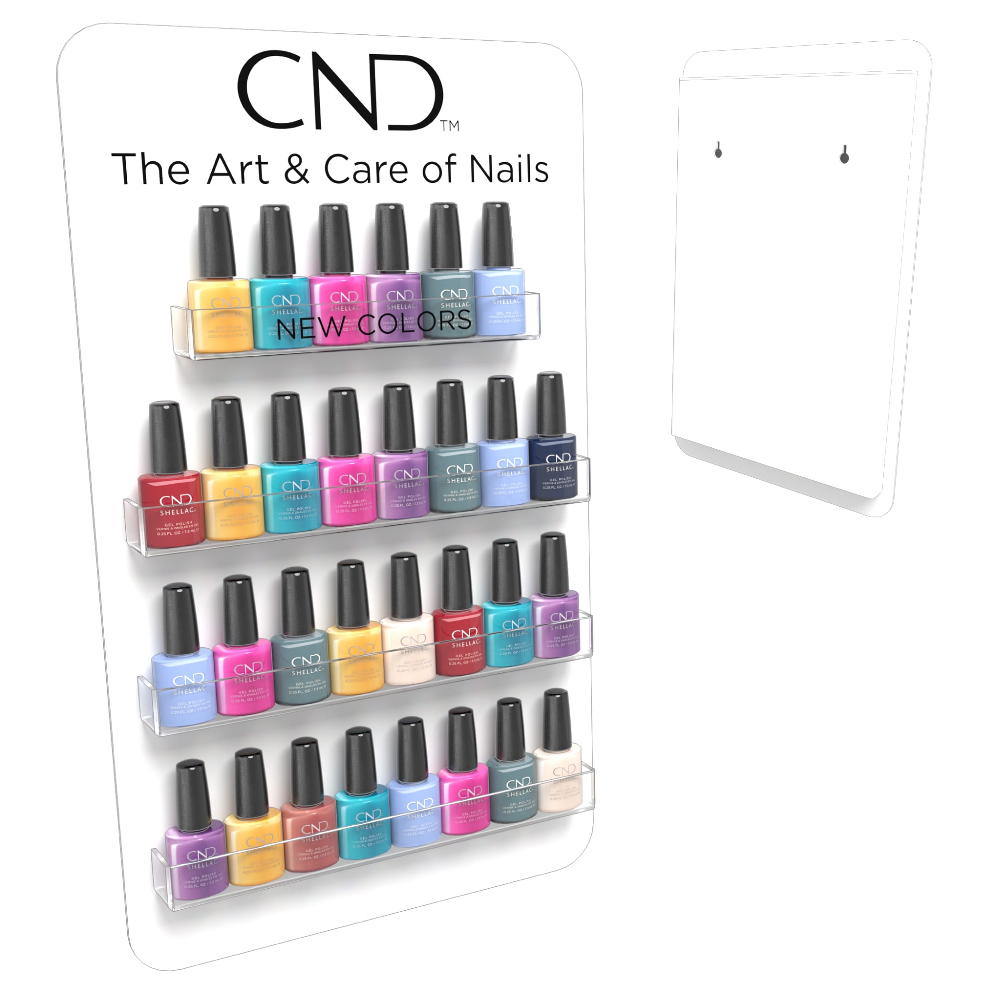 CND veggstativ som passer til både CND SHELLAC eller VINYLUX flasker. Stativet inkluderer en hylle for å presentere nye farger fra sesongens kolleksjon. Rommer opp til 30 flasker.